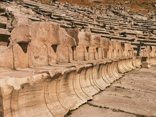Entre los asientos más famosos está el trono del sacerdote de Dioniso, decorado y más ancho que los demás.