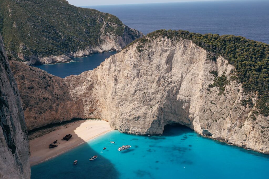 Navagio Beach es probablemente la imagen más famosa del país. Un antiguo barco encallado, arena blanca y paredes de roca que la rodean por completo.